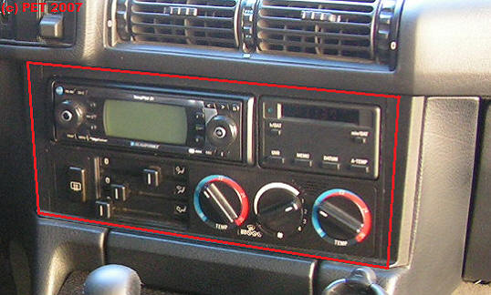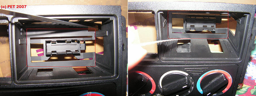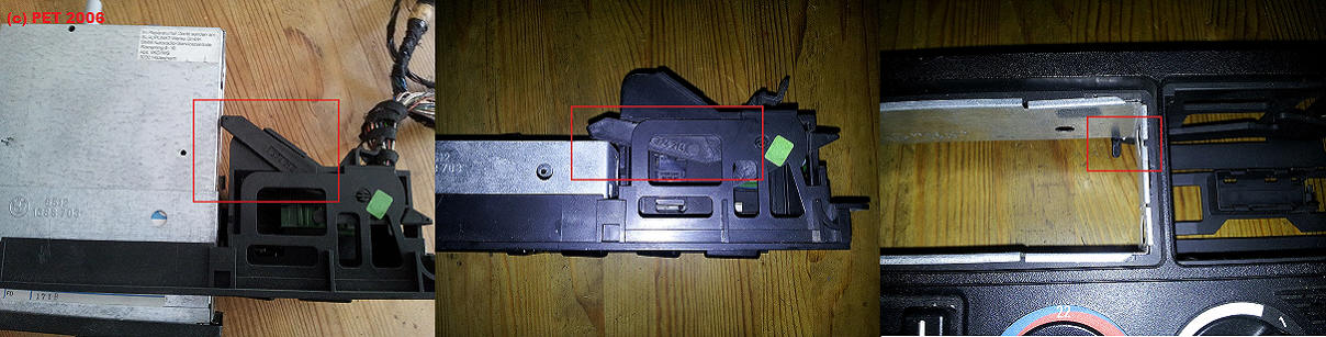 Um den Bordcomputer verbauen zu können - dieser ist länger als Analog und MF-Uhr - muss entweder der komplette Rahmen gegen einen BC fähigen getauscht oder die Rückwand gem. Vorlage mit einem langen Sägeblatt ausgesägt werden. Die Steckerhalterung wird nicht benötigt da der grüne Stecker direkt eingesteckt werden kann - der BC selber wird durch die obere Verriegelung gehalten.