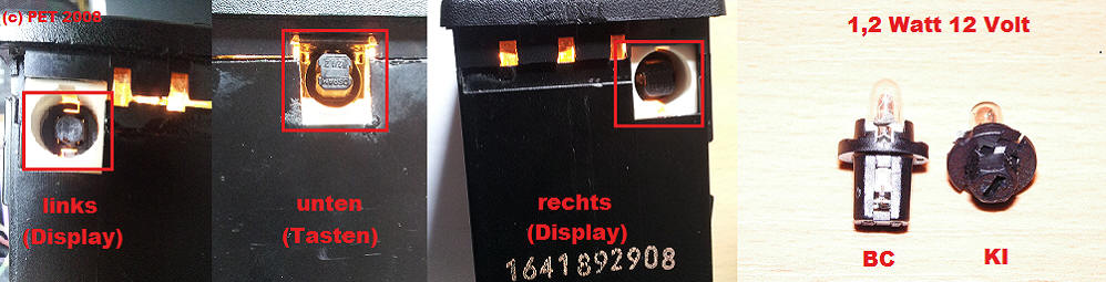 Die Beleuchtung erfolgt über drei 12 Volt 1,2 Watt Birnen (zwei für das Display, eine für die Tasten)
