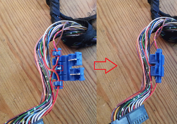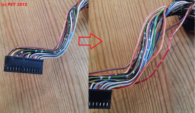 Nun Pin 9 und Pin 17 abzählen und die entsprechenden Kabel etwas aus dem Kabelbaum „auslösen“ um diese verbinden zu können. Hierbei auf passenden Abstand zum Stecker achten (siehe unten).