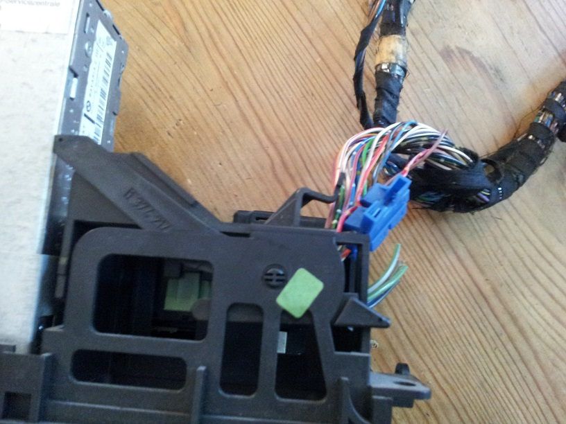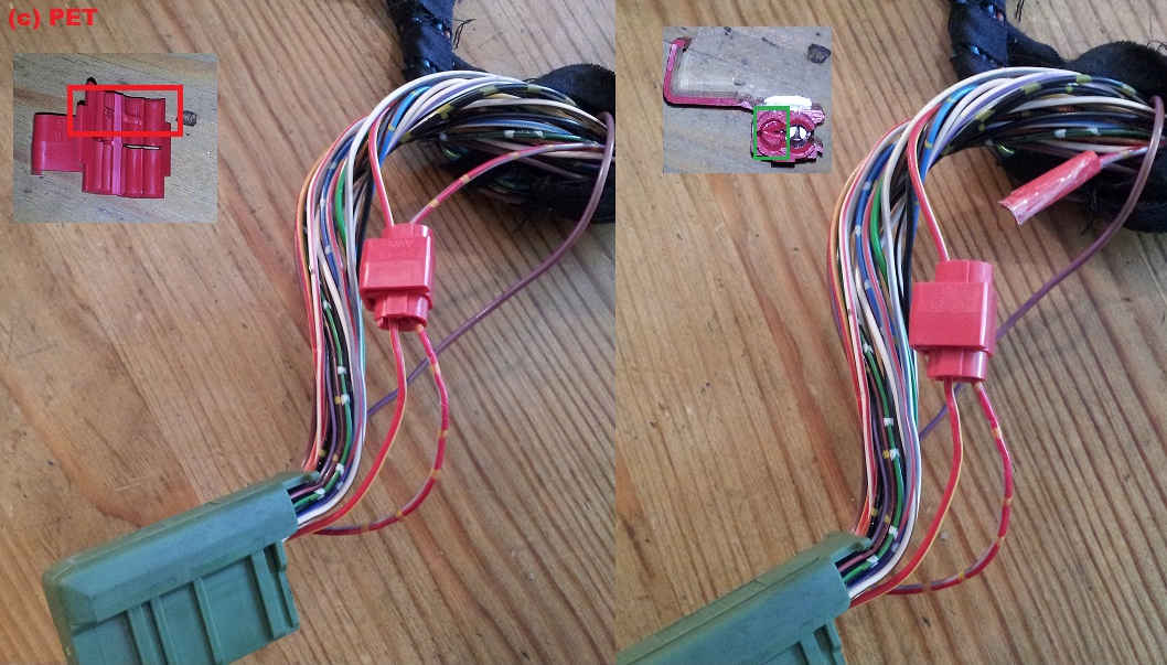 Um den Stecker aus der Halterung zu entfernen muss der grüne Stecker nach rechts geschoben werden. Stecker incl. Kabelbaum etwas nach vorne ziehen und den Kabelbinder am grünen Stecker zerschneiden. Das schwarze Innenteil kann nun aus dem grünen Steckerteil entfernt werden.