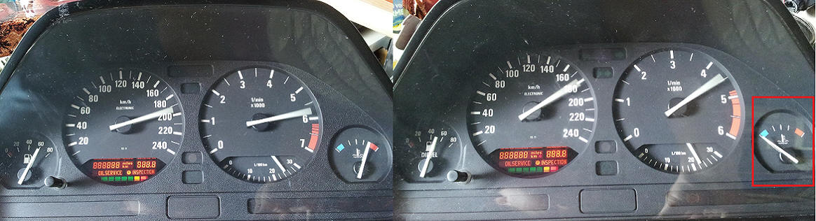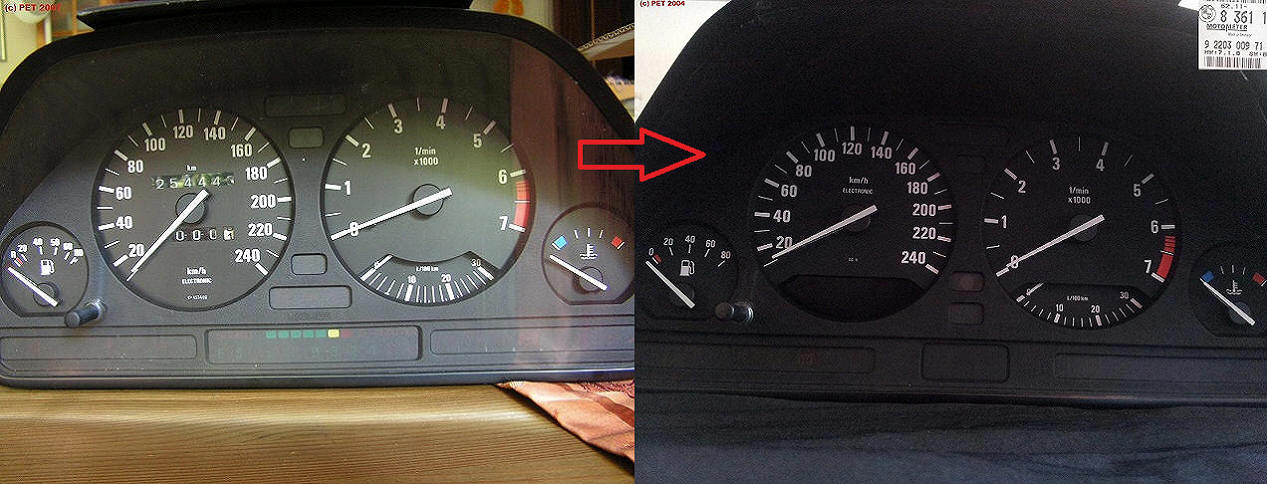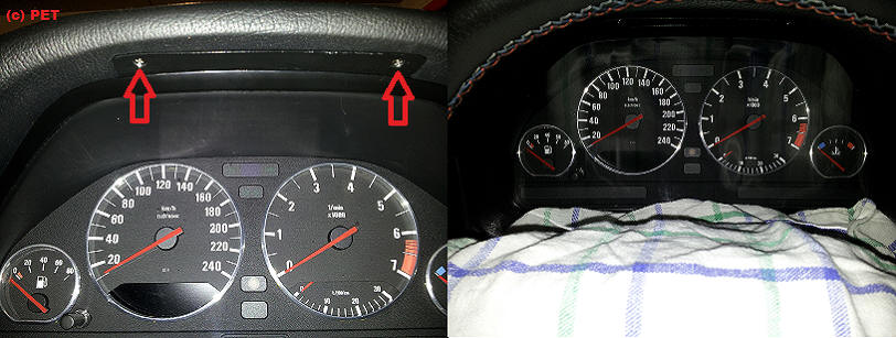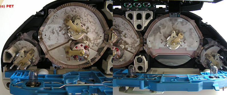 In regelmäßigen Abständen oder zumindest im Zuge eines Lampenwechsels sollte auch eine Reinigung der "Tachoscheiben" erfolgen. Die beiden unten stehenden Bilder sollten hier eigentlich selbsterklärend sein. Für die Reinigung der Scheiben einen angefeuchteten weichen Lappen oder einen Q-Tip verwenden - danach erstrahlt die Beleuchtung der Instrumente wieder in altem Glanz