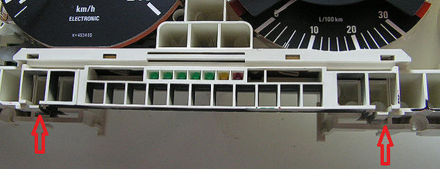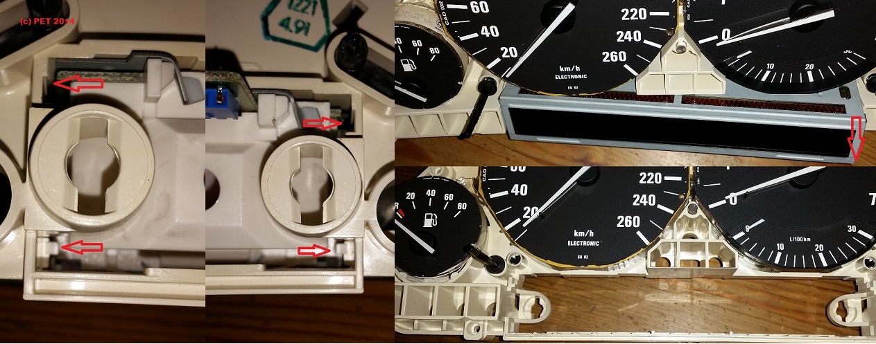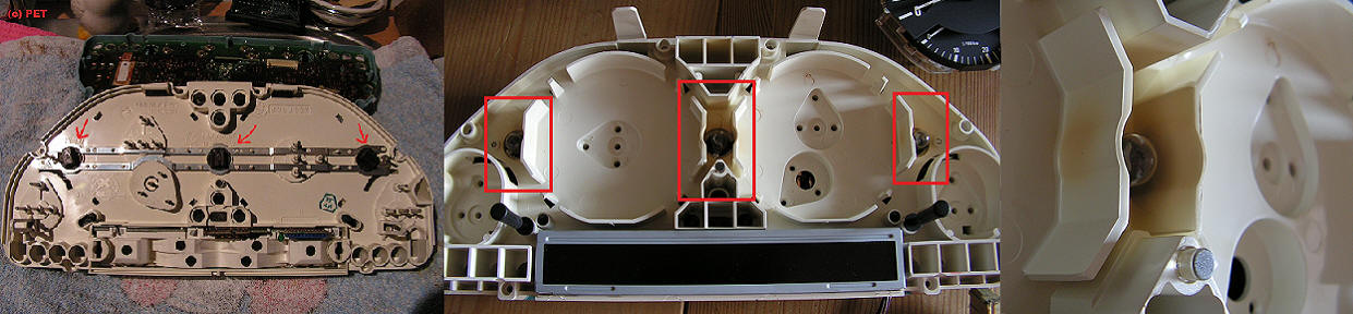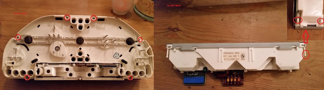 Um die Rückseite mit der Leiterplatte zu entfernen die beiden schwarzen "Verriegelungsschrauben" nach links drehen, die Abdeckung unten anfassen - vorsichtig nach oben klappen und komplett aushängen. Die 6 Schrauben an der weißen "Zwischenplatte" lösen - anschließend Kunststoffscheibe und bei Bedarf Instrumente entfernen.
