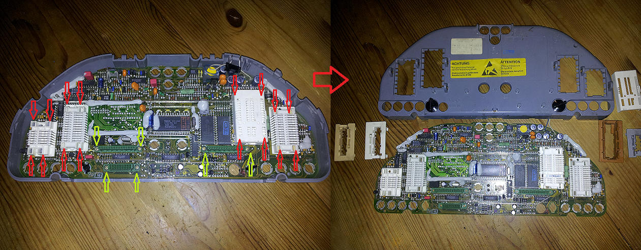 Jedoch gibt es hier keine 100% sichere Möglichkeit der Reparatur - Meine bisher durchgeführten Reparaturen an vier defekten Kombiinstrumenten mit anschließendem 14 tätigem Dauertest in meiner Testumgebung haben gezeigt das drei KIs anschließend keinerlei Defekte mehr innerhalb der Testphase aufwiesen jedoch das vierte bei seitlicher Betrachtung der Segmente leichte Helligkeitsunterschiede zeigte auch wenn die Segmente alle sichtbar waren.