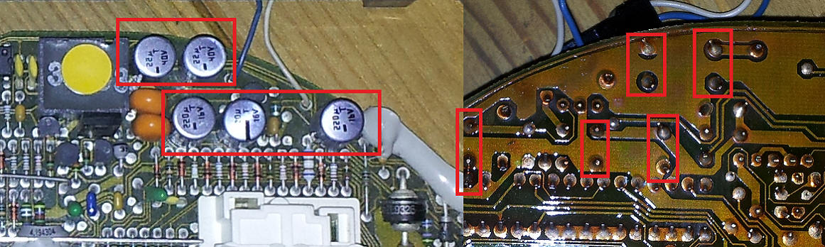 Da die Rückseite der Platine nun zugänglich ist können die gekennzeichneten Elkos ausgelötet und neue (Polung und Beschriftungen der Elkos beachten) eingesetzt werden.